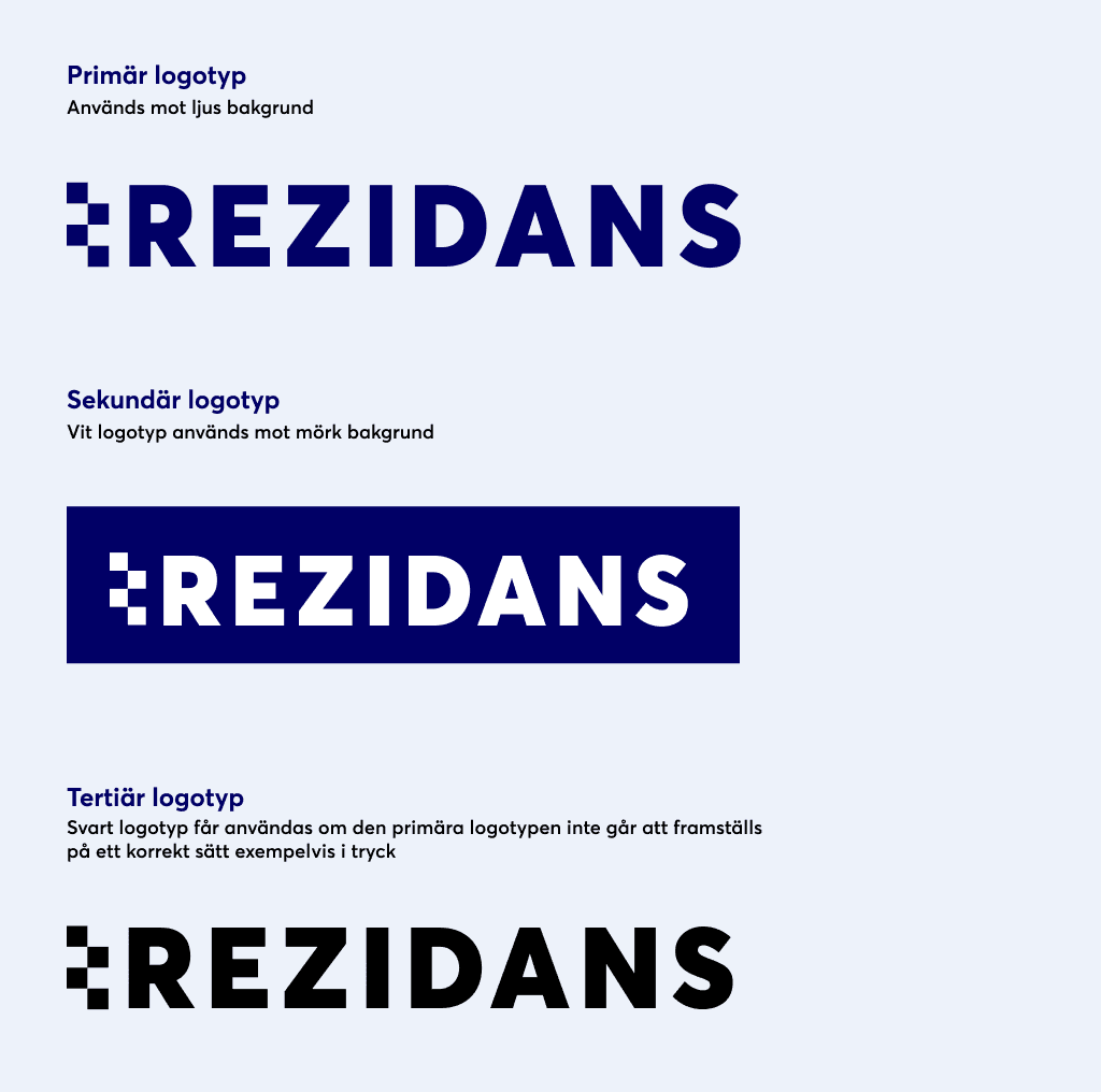 Rezidans logotyp är grunden i vår visuella identitet och en viktig bärare av vårt varumärke. För att säkerställa ett enhetligt uttryck får logotypen aldrig ändras, ritas om eller förvrängas. Logotypens ord- och bildmärke ska alltid användas tillsammans och i sina ursprungliga proportioner. Det är inte tillåtet att justera storlek, form eller relationen mellan dessa delar. Logotypen ska i första hand användas i sin primära originalfärg (blå), men får i sekundära fall användas i vitt eller svart om detta krävs för tydlighet.